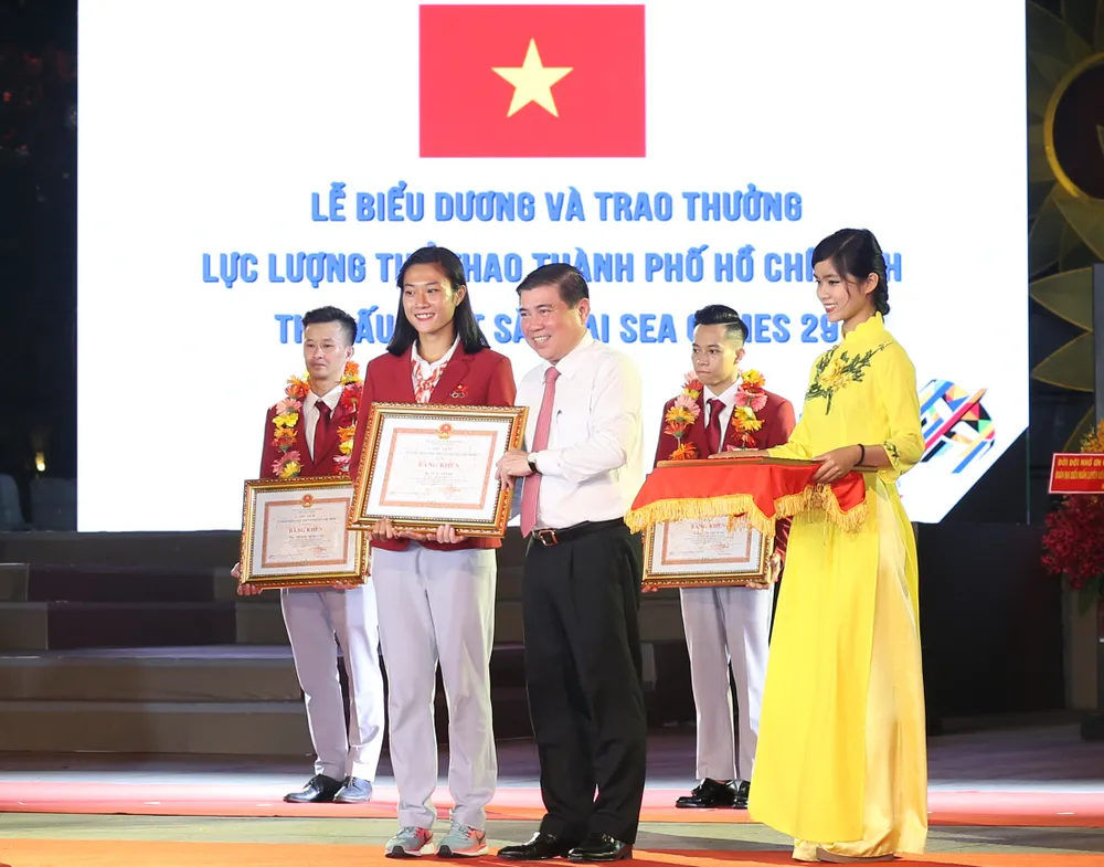 Bà Nguyễn Thị Quyết Tâm - Chủ tịch HĐND, trao thưởng cho các cầu thủ nữ.Với những thành tích xuất sắc tại SEA Games 29, UBND TPHCM khen thưởng theo chế độ với tổng số tiền 2,24 tỷ đồng, khen thưởng đột xuất tổng số tiền hơn 900 triệu đồng cho các huấn luyện viên và vận động viên. Bên cạnh đó, còn trao tặng 72 Bằng khen cho các cá nhân đạt thành tích cao.
