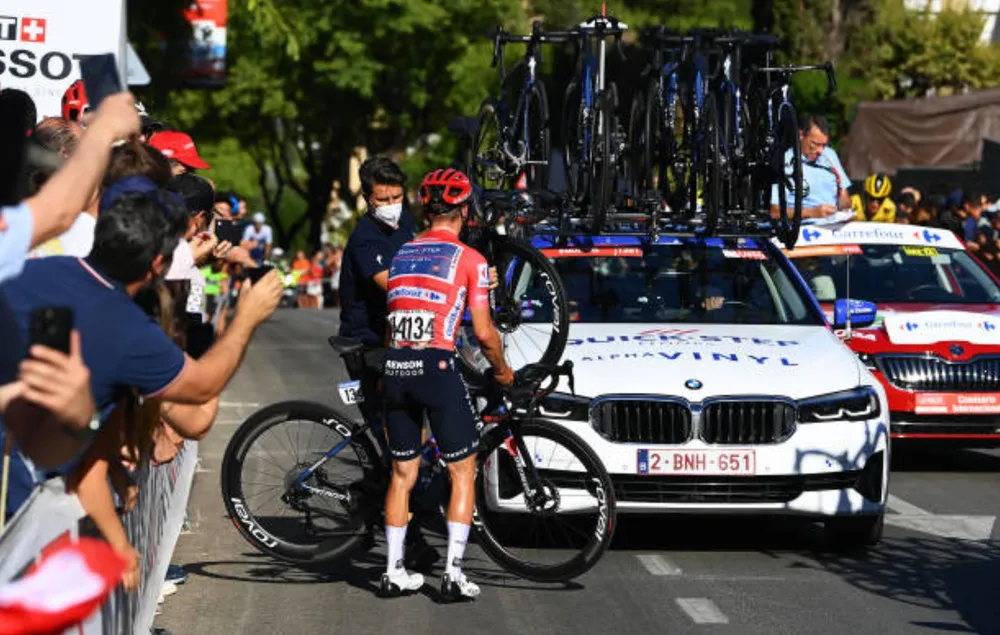 Trong lúc Primoz Roglic tấn công thì bất ngờ, xe đua của áo đỏ Remco Evenepoel gặp sự cố kỹ thuật phải dừng lại khá lâu. Theo luật, vì Remco Evenepoel gặp sự cố trong 3km cuối nên sẽ được tính đồng giờ với tay đua về cuối của nhóm mà anh đang thi đấu lúc gặp sự cố. Điều này càng khiến Primoz Roglic quyết tâm hơn trong guồng chân của mình để thoát khỏi nhóm bám đuổi phía sau.