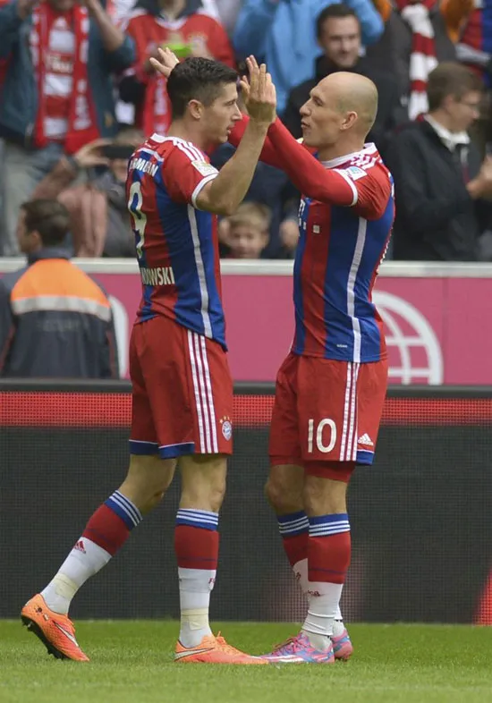 Arjen Robben (phải) và Robert Lewandowski, 2 chân sút hàng đầu của Bayern Munich ở Bundesliga mùa này.
