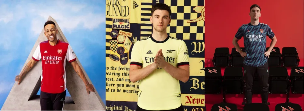 Áo đấu sân nhà Arsenal với các mảng màu trắng và đỏ kết hợp cùng chi tiết xanh navy trên cầu vai gợi nhớ về một kỷ nguyên hỏa lực vượt trội của Arsenal. Ở phiên bản dành cho sân khách, mẫu áo được tôn lên màu vàng, ghi dấu những khoảnh khắc thi đấu tuyệt vời của Arsenal đi kèm logo hình khẩu đại bác vô cùng ấn tượng. Áo đấu thứ 3 của Arsenal lấy cảm hứng từ biểu tượng "tia chớp xanh" nổi tiếng, từng xuất hiện trên áo đấu của Arsenal vào năm 1994 và 1995.