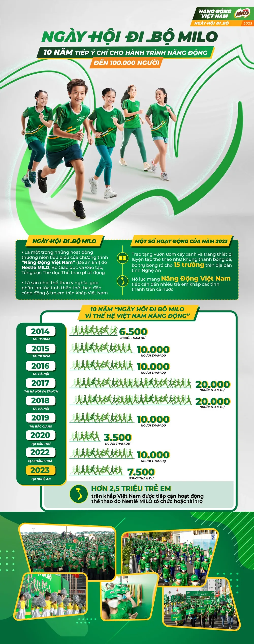Năm nay, đánh dấu hành trình 10 năm, Nestlé MILO lần đầu tiên đưa Ngày hội đi bộ MILO đến với tỉnh Nghệ An, hòa chung không khí với Ngày chạy Olympic vì sức khỏe toàn dân và đã nhận được sự ủng hộ của gần 7.500 học sinh, phụ huynh và người dân trong tỉnh.