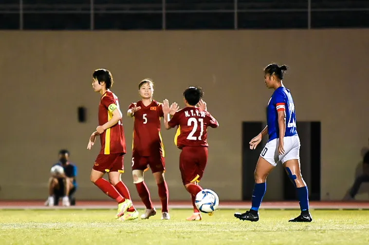 Cơn mưa lớn khiến mặt sân cỏ nhân tạo của Binan sũng nước, ảnh hưởng đến lối chơi của cả hai đội. Các cô gái Việt Nam dù ép sân nhưng gặp khó khăn trong việc đưa bóng vào vòng cấm Campuchia trong những phút đầu trận.
