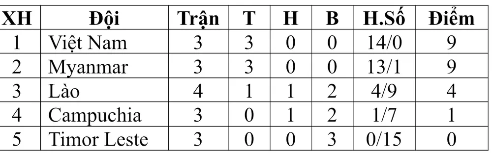 Ngoài ra, với hiệu số bàn thắng bại tốt hơn, Việt Nam tạm vươn lên ngôi đầu bảng và có lợi thế trước Myanmar ở trận đấu cuối.