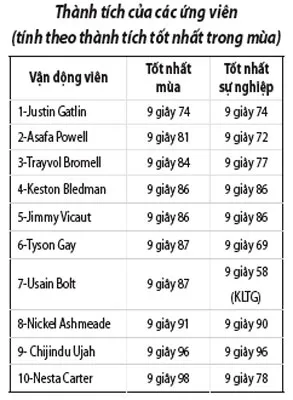 “Vua tốc độ” Usain Bolt đương nhiên là ứng viên nặng ký nhất cho ngôi vô địch. Anh đã giành 9/10 HCV ở các cự ly 100m và 200m trong các giải đấu hàng đầu thế giới suốt 7 năm qua (kể từ Olympic Bắc Kinh 2008). Tuy nhiên, khi Bolt bị chấn thương và tham gia thi đấu không nhiều trong mùa giải năm ngoái và năm nay, anh đã chứng kiến sự vươn lên không ngừng của Justin Gatlin, người đã trải qua 12 chiến thắng liên tiếp ở trong cự ly chạy 100m này. Với việc sở hữu thành tích xếp hàng đầu trên bảng thành tích của mùa giải năm nay, trên một khía cạnh nào đó, Gatlin mới là ngôi sao bị săn đuổi và khiến người khác muốn đánh bại ở Bắc Kinh năm nay.