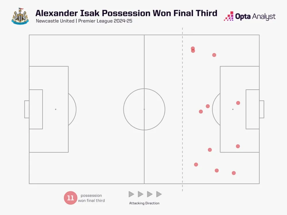 Không chỉ có những gì anh làm với quả bóng ở phần ba cuối sân. Isak cũng làm rất tốt công việc của mình khi không có bóng. Anh đã giành được quyền sở hữu bóng ở phần ba cuối sân của đối phương 11 lần tại Premier League mùa giải này, với Evanilson (15) của Bournemouth là tiền đạo trung tâm duy nhất làm được điều đó thường xuyên hơn.
