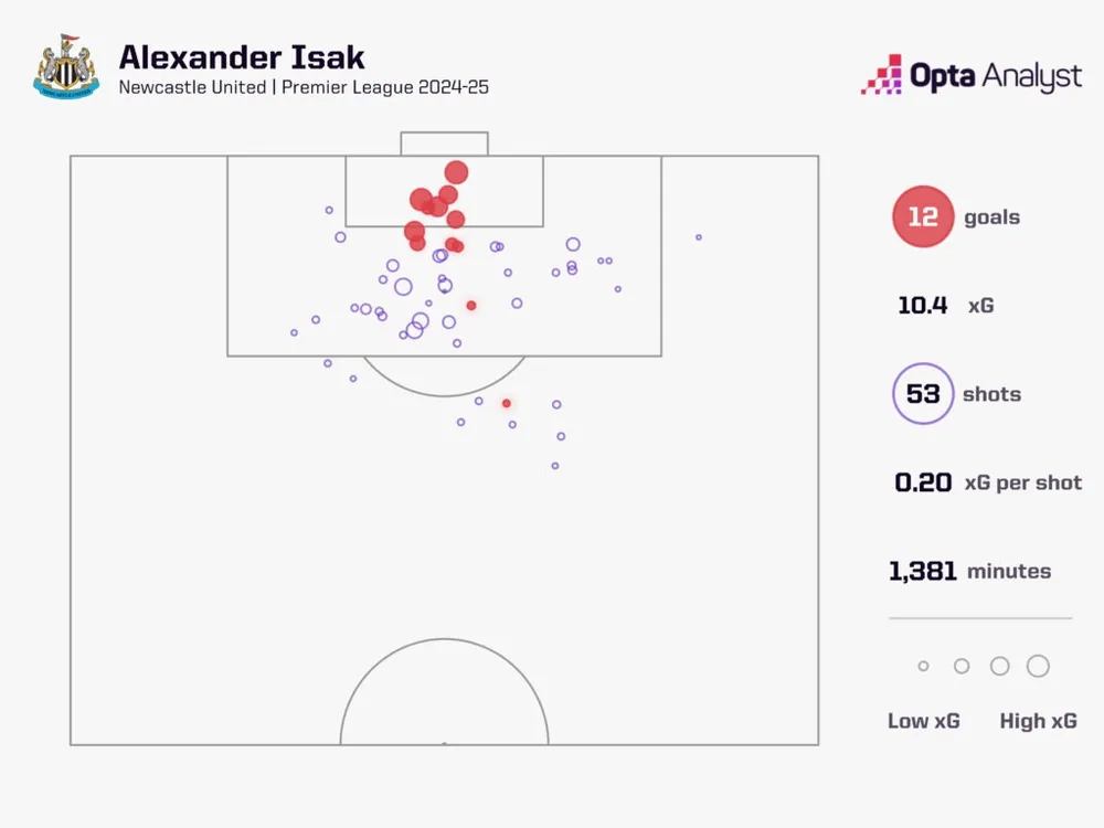 Anh nổi tiếng là người điềm tĩnh, lạnh lùng và tự tin trước khung thành đối phương, với tỷ lệ chuyển hóa cú sút thành bàn thắng ở Premier League mùa này là 22,6%, cao hơn 17,7% của Haaland và chỉ thấp hơn một chút so với 24,3% của Salah. Như bạn có thể thấy từ bản đồ mục tiêu của bên dưới, Isak thường xuyên vào những vị trí tốt để ghi bàn. Mười trong số 12 cú sút của anh ấy tại Premier League mùa này đều cách khung thành trong vòng vài mét. Trên thực tế, anh đã ghi bàn từ mỗi trong 10 nỗ lực gần khung thành nhất của mình, trong khi tất cả trừ một trong số 12 bàn thắng của anh đều là từ những cú sút giữa chiều rộng của cột dọc và không có quả phạt đền nào.