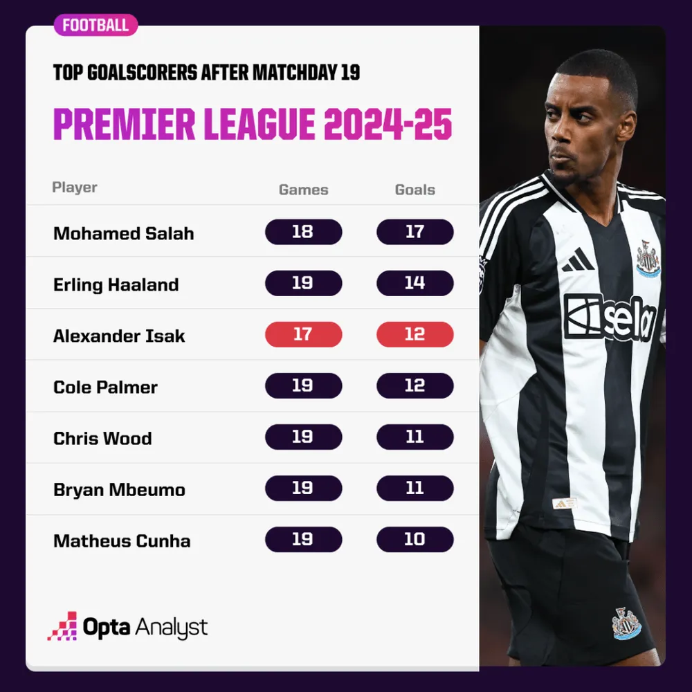 Isak đang đứng thứ ba trong cuộc đua Chiếc giày vàng Ngoại hạng Anh vào giữa mùa giải, ngang bằng với Cole Palmer với 12 bàn thắng, mặc dù Isak ra sân ít hơn ngôi sao của Chelsea hai lần (17 so với 19).