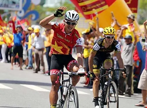 Tay đua trẻ Trần Nguyễn Duy Nhân (trái) về nhất chặng 1. Ảnh: T.L.
