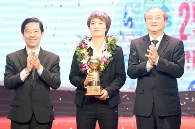 Tổng cục trưởng Tổng cục TDTT Vương Bích Thắng (bìa phải) và Phó TBT Báo SGGP, Trưởng BTC giải thưởng Nguyễn Thành Lợi trao giải QBV nữ cho Nguyễn Thị Minh Nguyệt