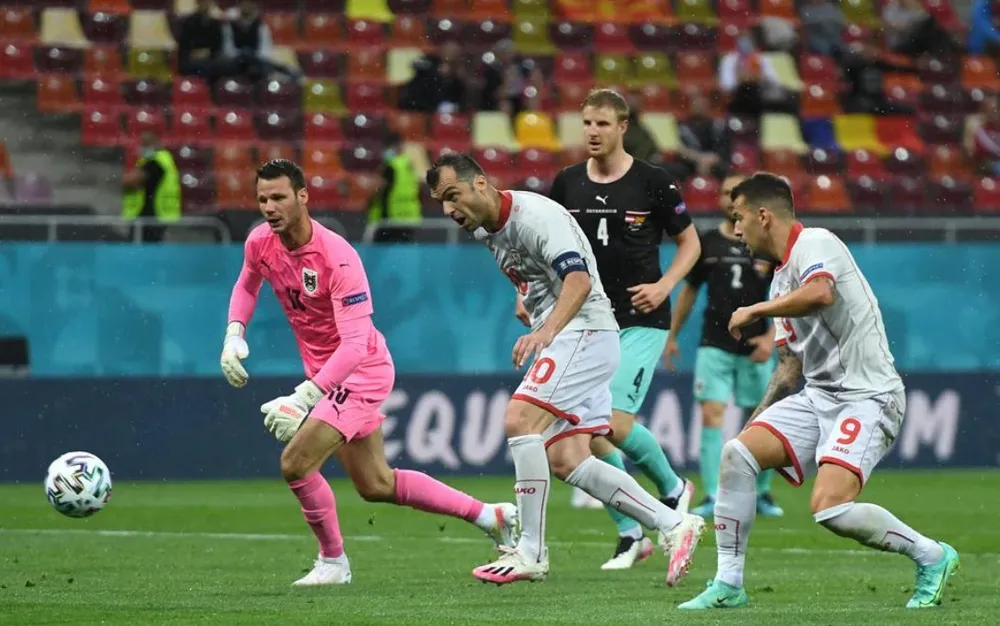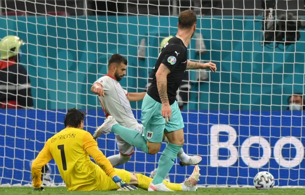 Thua thiệt về tầm vóc và thiếu sự phối hợp ăn ý nên những pha tấn công của Bắc Macedonia thường bị cắt đứt dễ dàng. Nhưng họ cũng bất ngờ tìm thầy bàn thắng gỡ hòa phút 28: Quả tạt từ biên trái của Alioski đã không trúng địa chỉ nhưng hậu vệ Áo lại phá bóng bật người nhau, bóng văng ngược vào khu cấm để Aleksandar Trajkovski lao theo. Thủ thảnh Daniel Bachmann lao ra cản phá và Goran Pandev đã tận dụng thời cơ để đệm bóng vào lưới trống.