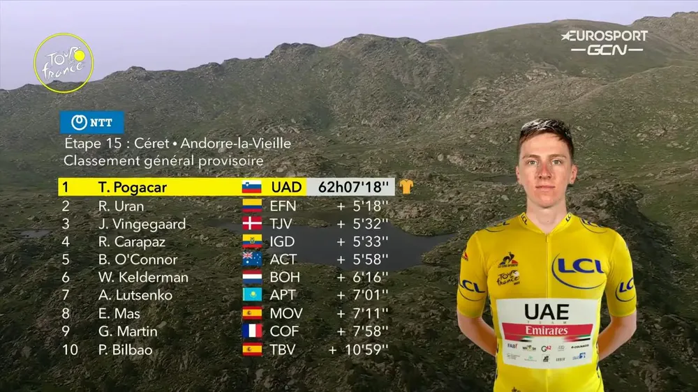 Áo vàng Tadej Pogacar về đích ở vị trí thứ 22, kém Sepp Kuss 4 phút 51 giây. Nhưng nhờ ôm chặt những đối thủ cạnh tranh trực tiếp nên anh tiếp tục bảo vệ thành công áo vàng tổng sắp với thành tích 62 giờ 7 phút 18 giây. Do Guillaume Martin (Cofidis) rớt sâu nên Rigoberto Urán (EF Education–Nippo) đã trở lại với vị trí thứ hai bảng tổng sắp cá nhân, kém Tadej Pogacar 5 phút 18 giây.