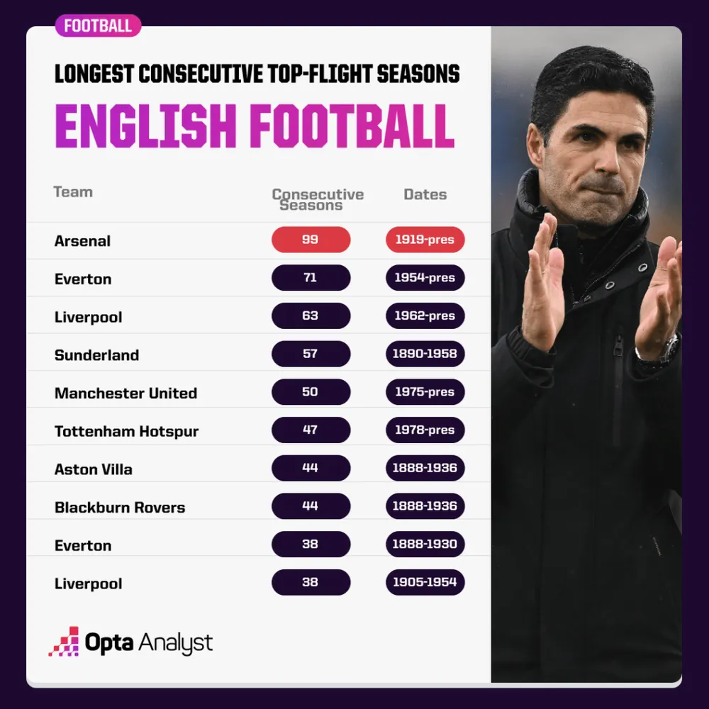 Dù việc tránh xuống hạng không phải là điều đáng ăn mừng đối với một câu lạc bộ tầm cỡ như Arsenal, thành tích này vẫn đánh dấu một cột mốc quan trọng. Arsenal đang nắm giữ kỷ lục về chuỗi mùa giải liên tiếp dài nhất ở hạng đấu cao nhất kể từ khi được “chọn” thi đấu tại First Division – Giải hạng Nhất cũ sau Thế chiến thứ nhất - khi giải đấu đó mở rộng từ 20 lên 22 đội.