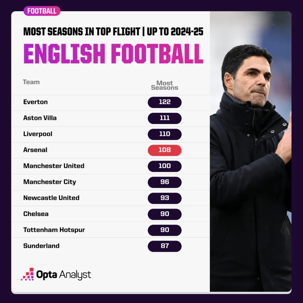 Aston Villa và Liverpool đều có nhiều mùa giải ở hạng đấu cao nhất hơn Arsenal, nhưng Everton mới là đội dẫn đầu với 122 mùa giải từng có mặt ở hạng đấu cao nhất cho đến nay. Tuy nhiên, dù truyền thống ghê gớm là thế nhưng Everton chỉ có một lần kết thúc trong top 10 ở 5 mùa giải gần nhất (vị trí thứ 10), và trong 30 năm qua, họ đã có ba lần kết thúc ngay trên vị trí xuống hạng.