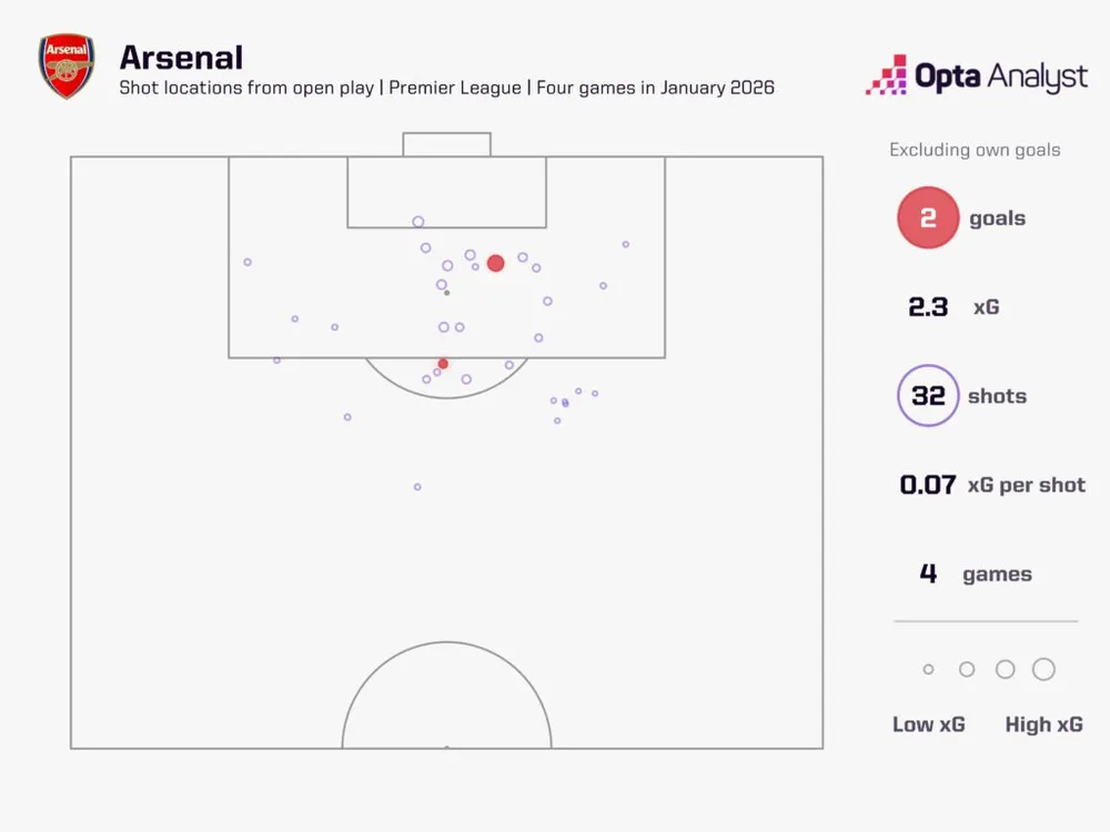 Nếu hàng thủ bắt đầu run, thì hàng công Arsenal đang rơi vào giai đoạn tê liệt. Trong bốn trận Premier League tháng 1, họ chỉ tạo ra 2,29 xG (bàn thắng dự kiến) trong bóng sống, trung bình chỉ 0,57 mỗi trận – thấp hơn hầu hết các đội, chỉ nhỉnh hơn Burnley, Wolves, Everton và Nottingham Forest.