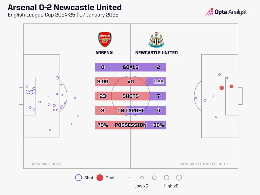 Thật vậy, Arsenal đã bỏ lỡ cả sáu cơ hội lớn của họ, bao gồm Gabriel Martinelli đánh trúng cột dọc trong một pha đối mặt, Kai Havertz đánh đầu hỏng ngay trước khung thành, và Jurriën Timber đánh đầu đơn giản đưa bóng đi vọt xà ngang từ quả phạt góc. Ngược lại, Newcastle đã ghi bàn trong cả hai cơ hội lớn của họ.