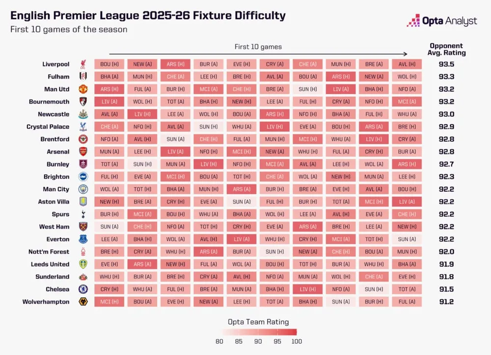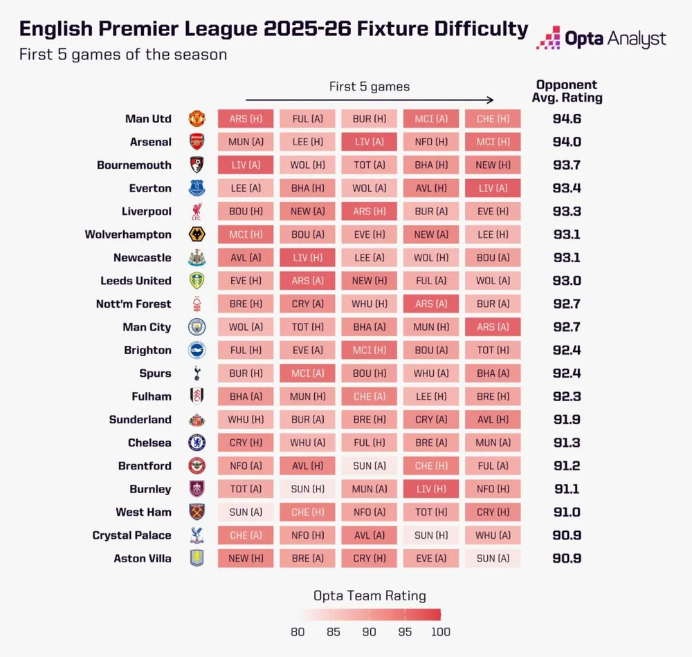Nếu căn cứ theo Bảng xếp hạng sức mạnh Opta Power, chỉ Manchester United có năm trận mở màn khó hơn đội bóng của Mikel Arteta khi gặp các đối thủ mạnh. Arsenal khởi đầu mùa giải với các trận gặp Man United, Liverpool và Manchester City, cùng các trận sân nhà với Leeds và Nottingham Forest, hai đội đều sẽ là thử thách lớn.