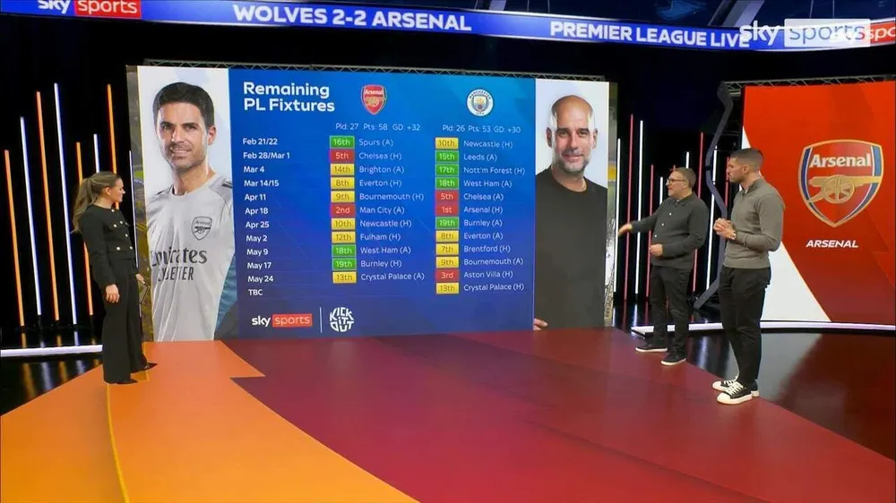 Tuần tới, Arsenal đối đầu Tottenham ở derby Bắc London. Nếu Man City thắng Newcastle ở trận đấu diễn ra trước, áp lực tăng gấp bội. Theo đánh giá của Merson thì: "Đà tiến triển đảo chiều hoàn toàn. Derby Bắc London là trận cân bằng, bất kể vị trí. HLV mới Tottenham sẽ khiến họ chơi quyết liệt. Arsenal không đủ tốt để thổi bay họ". Kế tiếp là trận derby London khác với Chelsea. Arsenal cần thắng Tottenham để lấy lại đà. Nhưng với Man City đá trước, áp lực chồng chất. Merson đánh giá: "Nếu Man City thắng, Arsenal chỉ hơn hai điểm dẫn và chơi hai derby lớn." Còn Smith: "Man City cảm nhận nỗi sợ Arsenal. Với kinh nghiệm, họ sẽ vượt qua".