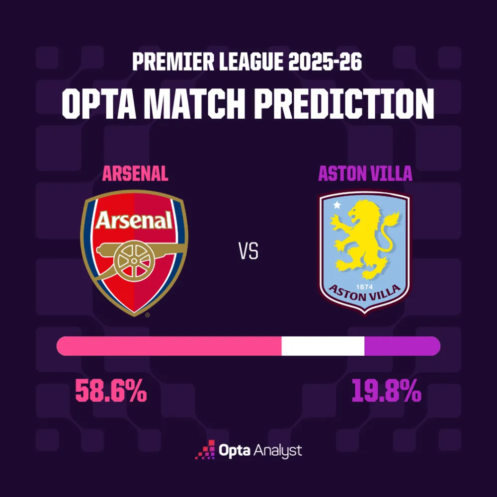 Theo mô hình của máy tính Opta, Arsenal thắng 59,7%, Villa thắng 19,2%, còn hòa là 21,1%.