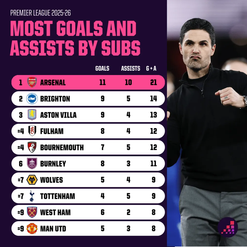 Trong khi đó, Arsenal đang tiến gần đến kỷ lục về số lần đóng góp từ dự bị trong một mùa giải. Và trong kỷ nguyên mà các cầu thủ vào sân từ ghế dự đóng vai trò quan trọng hơn bao giờ hết, cách sử dụng họ của Mikel Arteta có thể là sự khác biệt lớn nhất trong cuộc đua vô địch Premier League 2025-26.