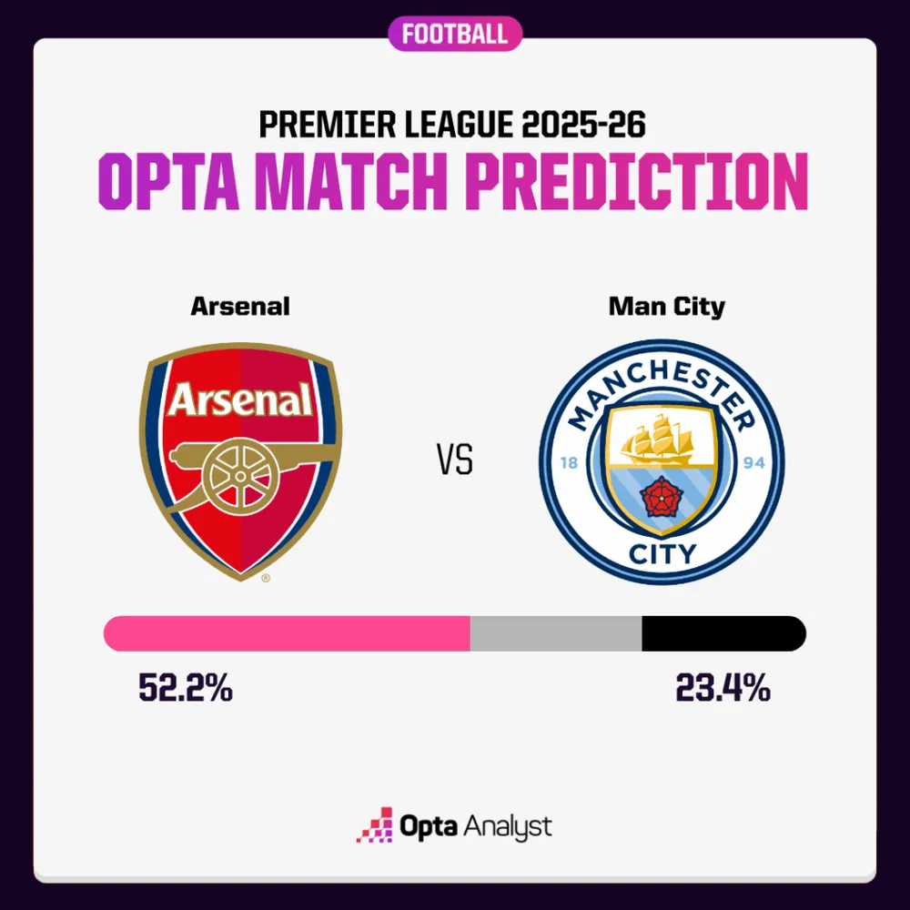 Dự đoán: Siêu máy tính Opta dự đoán Arsenal thắng trong 52,2% mô phỏng, City có 23,4% cơ hội thắng, thấp hơn chút so với khả năng hòa (24,4%).