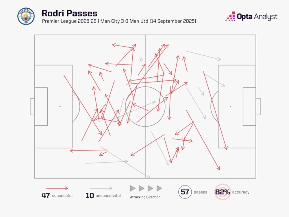 Việc coi chủ nhân Quả Bóng Vàng là điểm yếu của Man City nghe có vẻ kỳ lạ, nhưng hãy xem xét. Trong chiến thắng 3-0 trước Man United, Rodri đôi lúc không theo kịp nhịp độ trận đấu, đặc biệt khi bị gây áp lực. Tỷ lệ chuyền bóng chính xác của anh chỉ đạt 82,5%, thấp thứ hai trong sự nghiệp tại Premier League (79,7% trước Brighton, tháng 10/2022). Dưới áp lực cao, anh chỉ hoàn thành 73,7% số đường chuyền, mức thấp nhất kể từ mùa 2022-23.