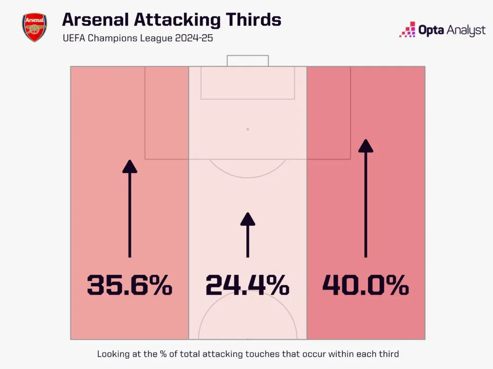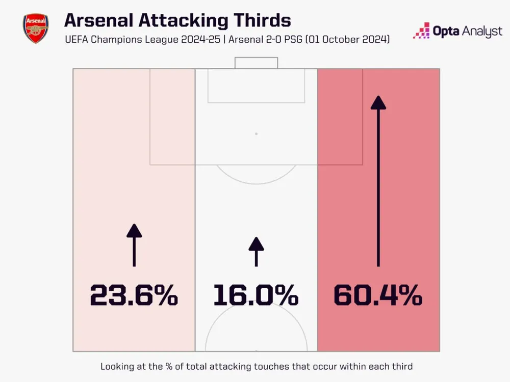 Cầu thủ chạy cánh người Anh đóng vai trò quan trọng với Arsenal bởi anh có thể tạo ảnh hưởng theo nhiều cách: từ các tình huống cố định, vượt qua hậu vệ đối phương, kiến tạo cho đồng đội hoặc tự mình ghi bàn. Sự tin tưởng của Arsenal vào Saka được thể hiện qua việc chỉ có bốn đội tại Champions League mùa này có tỷ lệ chạm bóng ở nửa sân tấn công từ cánh phải cao hơn Arsenal (40%).