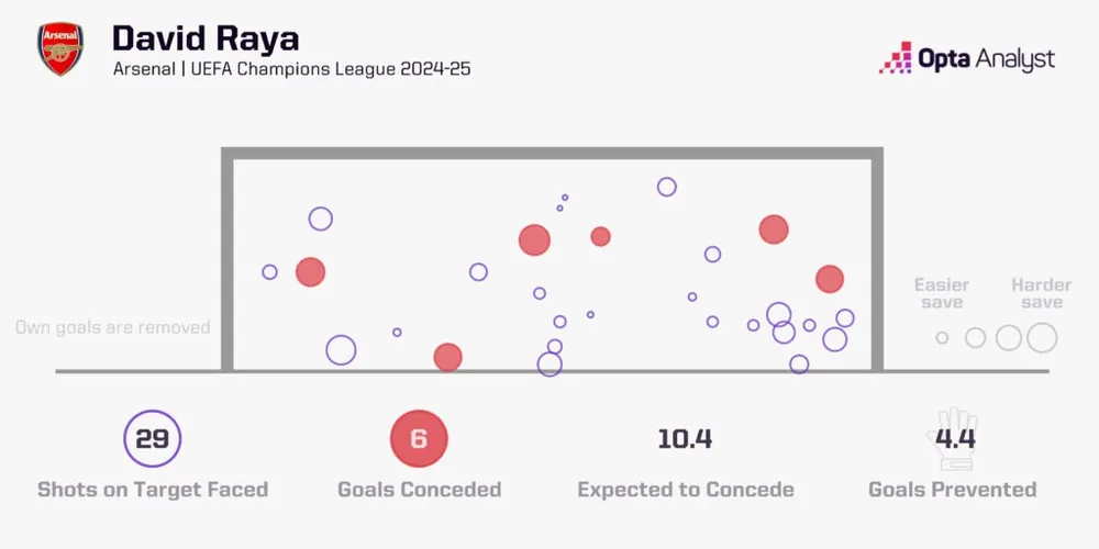 Những pha cứu thua của Raya ít kịch tính hơn nhưng ổn định hơn trong suốt mùa giải. Anh chỉ thủng lưới sáu bàn trong 11 trận Champions League mùa này, dù đối mặt với các cú sút có tổng giá trị 10,4 bàn thắng kỳ vọng trên mục tiêu (xGOT), nghĩa là anh đã ngăn chặn 4,4 bàn so với mức trung bình mà một thủ môn thông thường sẽ để thủng lưới khi đối mặt với những cú sút đó.