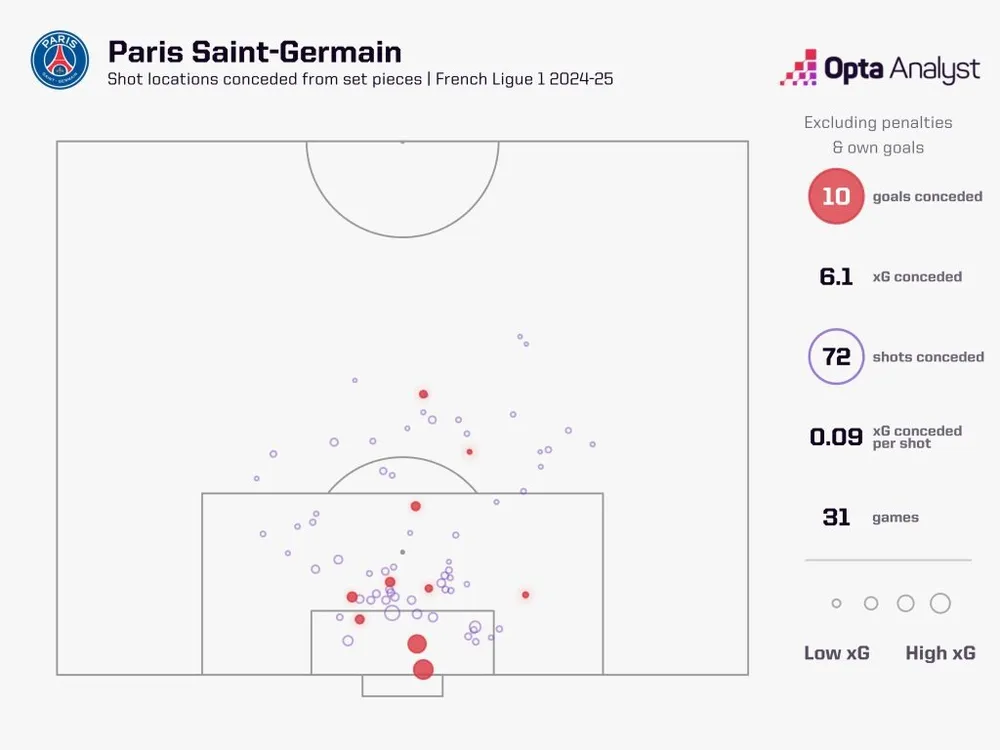 Tại Ligue 1 mùa này, chỉ có bốn đội (đều 11 bàn) để thủng lưới nhiều bàn từ tình huống cố định (không tính bàn phản lưới) hơn PSG (10). Con số này chiếm 32,3% tổng số bàn thua của họ, là tỷ lệ cao nhất tại giải đấu hàng đầu Pháp.