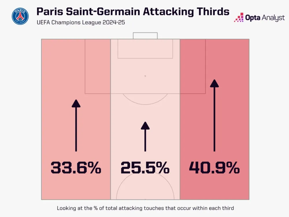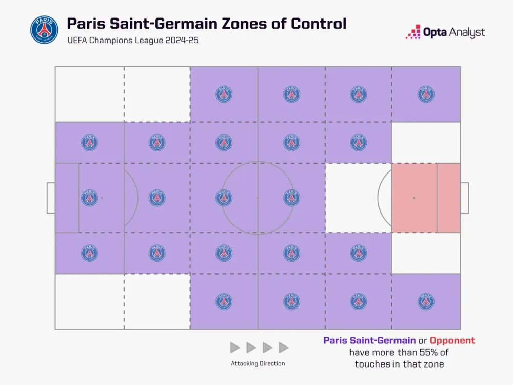 Chỉ có Bayern Munich (65,2%) có tỷ lệ kiểm soát bóng trung bình cao hơn PSG (63,8%), dù PSG dẫn đầu về số đường chuyền mỗi trận (668,2) và đường chuyền thành công (598,4). Họ cũng nằm trong top ba về đường chuyền ở khu vực một phần ba cuối sân (199,6), đường chuyền ở nửa sân đối phương (379) và số lần chạm bóng trong vòng cấm đối thủ (39,4).