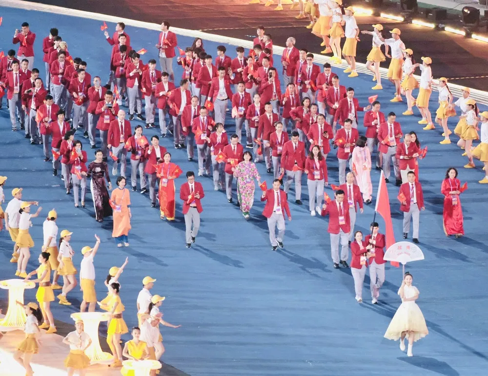 Tại lễ khai mạc, các nghi thức quan trọng nhất được tổ chức theo đúng thông lệ khi đại diện của trọng tài và đại diện của VĐV nước chủ nhà Trung Quốc đã có mặt phát biểu tuyên thệ. Cùng với đó, đoàn thể thao của 45 quốc gia và vùng lãnh thổ đã thực hiện lễ diễu hành tại lễ khai mạc. Đoàn thể thao Việt Nam có mặt tại lễ diễu hành của lễ khai mạc với hai tuyển thủ Nguyễn Huy Hoàng, Nguyễn Thị Hường giương cao lá quốc kì cờ đỏ sao vàng đi trước. Phía sau là Trưởng đoàn thể thao Việt Nam Đặng Hà Việt cùng các thành viên tham dự lễ khai mạc. Sự xuất hiện của thể thao Việt Nam tại lễ khai mạc ASIAD 19 cũng đánh dấu sự có mặt chính thức của chúng ta tại kì ASIAD 19 này.