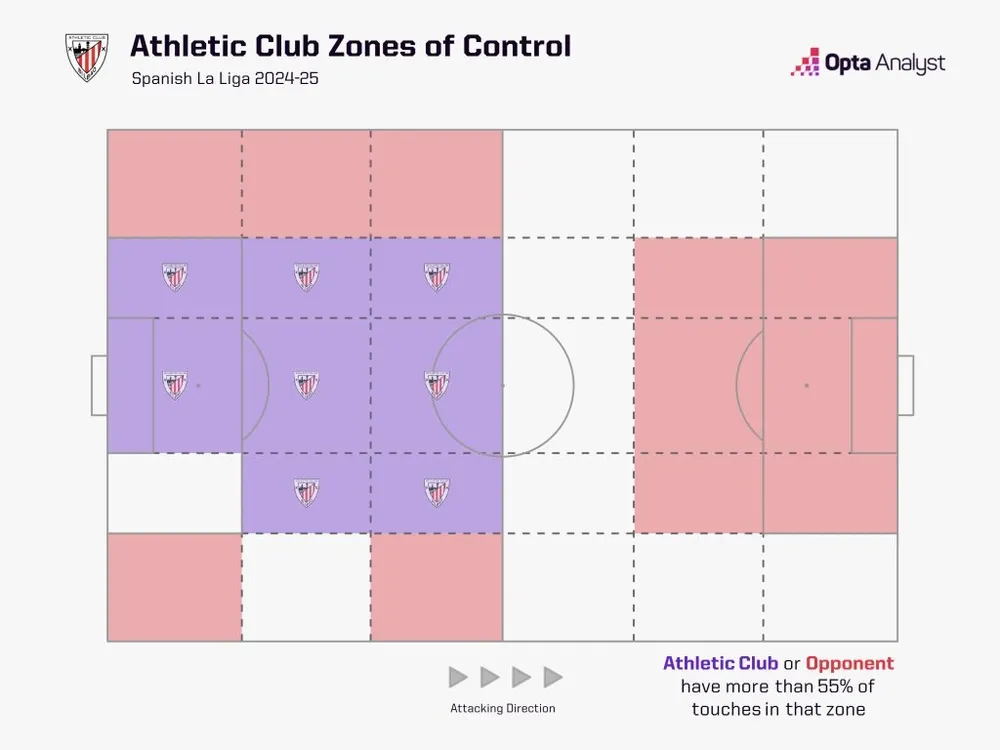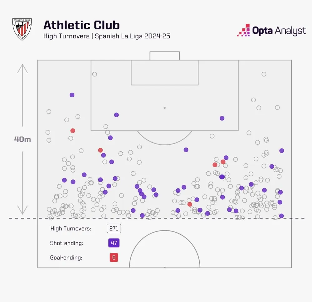 Không đội nào ở La Liga giỏi hơn trong việc nhặt bóng lỏng ở khu vực giữa sân. Athletic trung bình có 22.5 lần giành lại quyền kiểm soát mỗi trận ở khu vực này, nhiều hơn bất kỳ đội nào ở giải đấu hàng đầu Tây Ban Nha. Không phải là đè bẹp đối thủ, mà khiến bạn nghĩ mình có một giây để thở, rồi cướp bóng trước khi bạn kịp sử dụng.