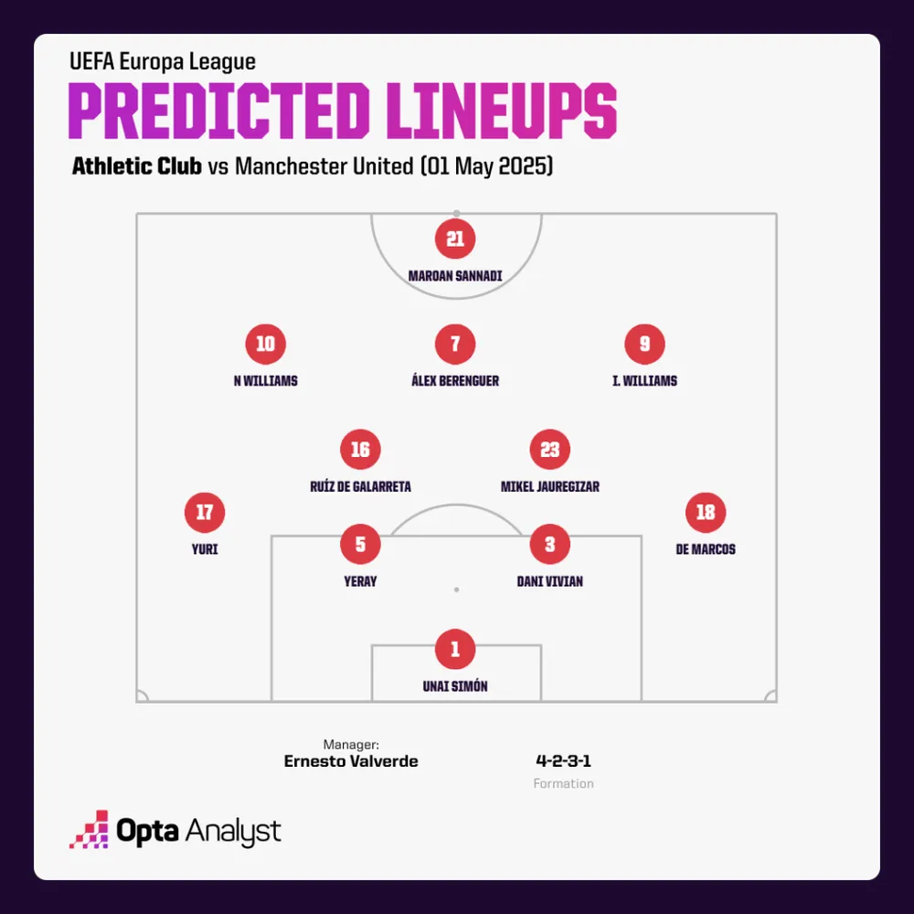 Athletic chịu một tổn thất lớn khi tay săn bàn hàng đầu Oihan Sancet có thể bỏ lỡ ít nhất trận lượt đi (và có thể cả lượt về) sau chấn thương cơ bắp gặp phải trước Las Palmas. Tuy nhiên, ngoài điều đó, Valverde có một đội hình khỏe mạnh, được xoay vòng và sẵn sàng chờ United ở Bilbao. Nếu Quỷ đỏ không thể sánh ngang Athletic Club về thể lực, không chỉ trong tranh chấp mà còn trong việc giành bóng thứ hai, họ có thể phải dành phần lớn trận lượt về tại Old Trafford để rượt đuổi một trận đấu đã tuột khỏi tay ở Bilbao.