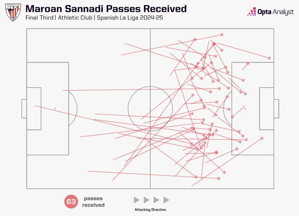 Khi anh di chuyển, không phải lúc nào cũng đẹp mắt. Anh đứng thứ tư trong số các tiền đạo La Liga có ít nhất 400 phút thi đấu mùa này về khoảng cách trung bình mang bóng lên phía trước (8.6 mét), nhưng những pha dẫn bóng của anh hỗn loạn, chạm bóng lỏng lẻo, và hoàn toàn không thể đoán trước. Và đó chính là điểm mấu chốt. Chính trong sự hỗn loạn này, Man United cần giữ kỷ luật và không bị cuốn theo. Sannadi có thể nhanh chóng kéo giãn đội hình đối phương, và Athletic được thiết kế để nhặt những mảnh vỡ.
