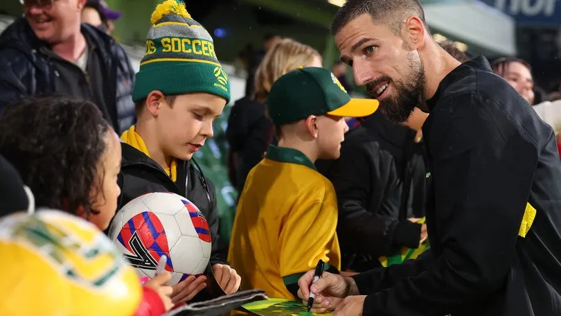 Milos Degenek ký tặng người hâm mộ sau buổi tập của Socceroos tại HBF Park. Ảnh: Paul Kane/Getty Images