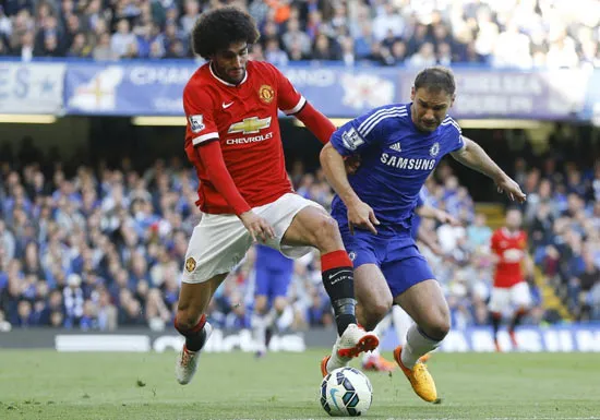 Marouane Fellaini (trái) đối mặt Branislav Ivanovic.