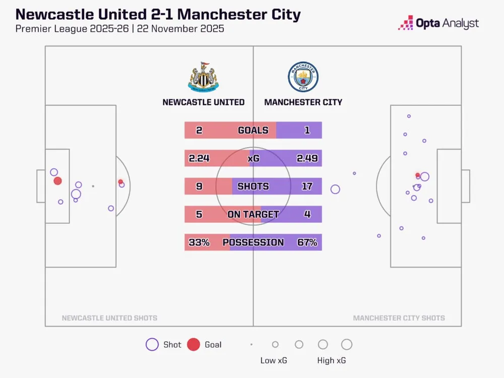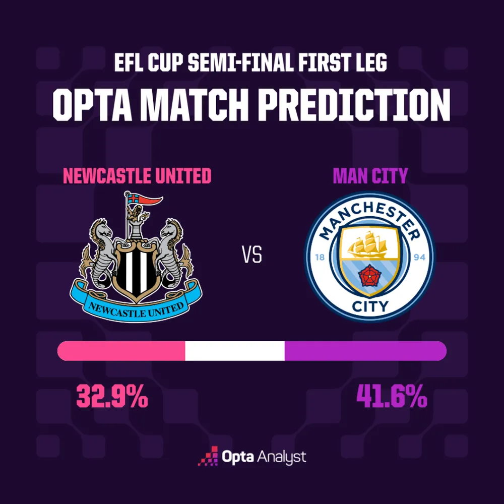 Lịch sử đang ủng hộ Man City – họ từng hạ hai nhà vô địch gần nhất của giải trong các mùa 2011 và 2022 – nhưng Newcastle lại có thói quen biến những trận đấu này thành cuộc chiến ý chí. Theo dữ liệu của Opta, xác suất chiến thắng của City chỉ nhỉnh hơn đôi chút (41,6%) so với Newcastle (32,9%), trong khi khả năng hòa là 25,5%.