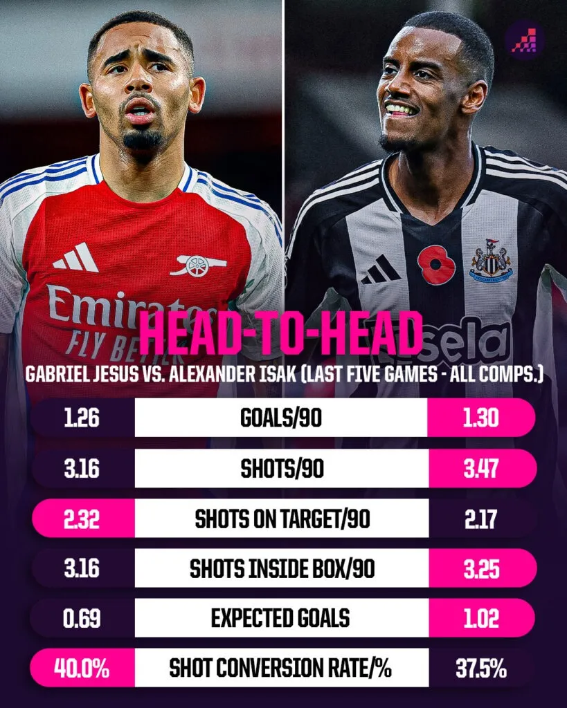 Isak là người có phong độ tốt, ghi bàn trong 11 trong số 14 lần ra sân gần nhất cho Newcastle (Tham gia tổng cộng 13 bàn thắng). Nếu anh ấy ghi bàn trong trận đấu này, anh ấy sẽ trở thành cầu thủ đầu tiên của Newcastle ghi bàn vào lưới Arsenal trong hai trận đấu khác nhau trong một mùa giải kể từ Laurent Robert vào năm 2001-02.