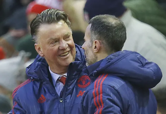 HLV Van Gaal cười tươi với trợ lý Ryan Giggs sau chiến thắng Liverpool.