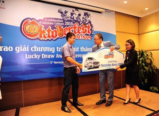 Trao chìa khóa chiếc Mercedes-Benz C 200 cho ông Trần Minh Đức, ông Adwin Chong, Tổng Quản lý khách sạn Windsor Plaza, đã chúc mừng các khách trúng giải và bày tỏ lòng cảm kích những thực khách đã góp phần tạo một lễ hội thành công tốt đẹp. Oktoberfest Việt Nam được tổ chức tại khách sạn Windsor Plaza từ năm 2005 và được hãng tin Reuters công nhận trong Tốp 10 Lễ hội bia Đức hàng đầu thế giới bên ngoài nước Đức, cũng như được giới thiệu trên tạp chí Chicago Tribune danh tiếng. Lễ hội Đức nổi tiếng hàng năm này đã tái hiện bầu không khí đích thực của Oktoberfest truyền thống bắt nguồn từ Munich với các khách tham dự mặc trang phục dân gian xứ Bavaria cổ tích, hòa mình vào điệu nhảy đầy ngẫu hứng của những bản nhạc Oktoberfest sôi động. Suốt chương trình là tiệc buffet với nhiều món ngon truyền thống Đức như xúc xích, bắp cải muối, giò heo muối nướng, bánh mì vòng… Khách còn được thoải mái thưởng thức bia Đức nhập khẩu không giới hạn như bia tươi Krombacher, bia lúa mì Schneider Weisse.