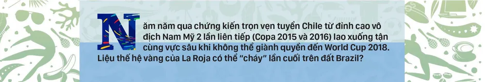 Năm năm qua chứng kiến trọn vẹn tuyển Chilê từ đỉnh cao vô địch Nam Mỹ 2 lần liên tiếp (Copa 2015 và 2016) lao xuống tận cùng vực sâu khi không thể giành quyền đến World Cup 2018. Liệu thế hệ vàng của La Roja có thể “cháy” lần cuối trên đất Brazil?