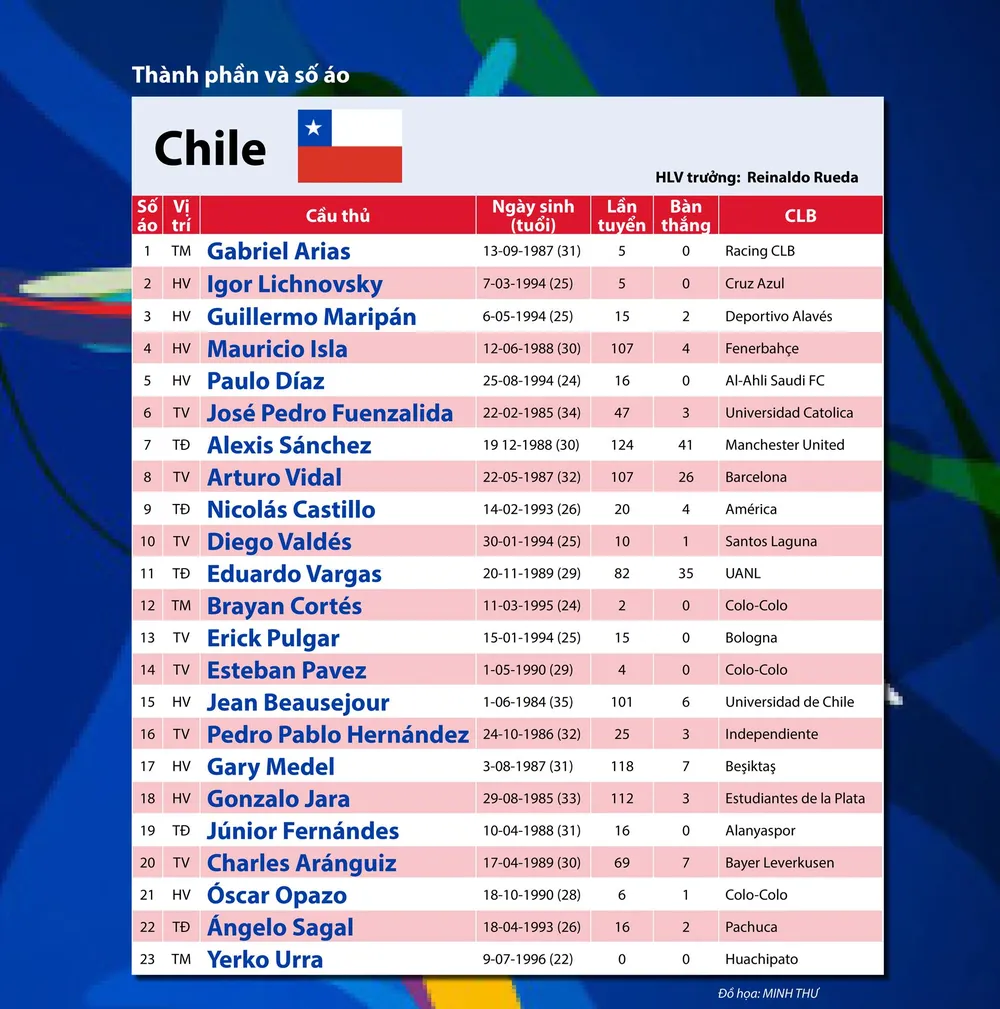 Chilê có kinh nghiệm và đẳng cấp của một nhà vô địch, và đó là yếu tố rất quan trọng ở một kỳ giải lớn như Copa America. Tuy nhiên, điều mà họ đang thiếu lúc này là tính thống nhất và quyết tâm của một tập thể chất lượng hàng đầu từng có vài năm trước. Vì vậy, vị thế ứng viên của thầy trò HLV Rueda cũng từ đó trở nên nhạt hơn.