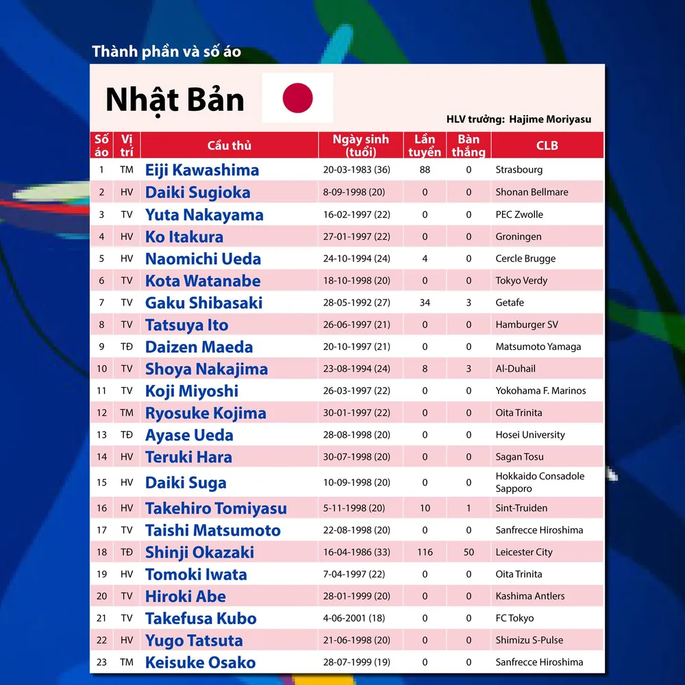 Nếu Shinji Okazaki đến với World Cup 2018 trong sự kỳ vọng, sau 3 mùa giải khá thành công ở giải Ngoại hạng Anh cùng Leicester - bao gồm là thành viên của tập thể đăng quang Premier Leaggua khó tin ở mùa 2015-2016. Tuy nhiên, ở tuổi 33, Okazaki cũng vừa được Leicester giải phóng hợp đồng sau mùa giải vừa kết thúc - anh ra sân 25 lần nhưng hầu hết từ ghế dự bị, và cũng không ghi được bàn nào. Tuy nhiên, như đã nói thì đây là chuyến “tu nghiệp” của các tài năng trẻ, nên Okazaki với kinh nghiệm và đẳng cấp từng có sẽ là điểm tựa quan trọng của đội.