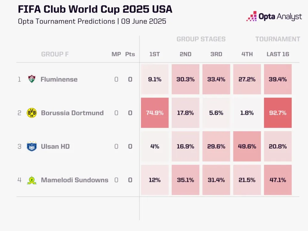 Mặc dù mùa giải 2024-25 không hoàn toàn suôn sẻ với BVB, họ bước vào giải đấu này với tinh thần tuyệt vời. Họ đã thắng cả 6 trận gần nhất ở mọi đấu trường, ghi ít nhất ba bàn mỗi trận và tổng cộng 20 bàn trong các trận đó. Dù chuỗi trận này khó có thể kéo dài suốt mùa hè, nó củng cố dự đoán của siêu máy tính Opta rằng Dortmund có 92,7% khả năng vào vòng 16 đội. Họ đứng cao hơn ít nhất 120 bậc so với ba đội còn lại trong bảng F theo Bảng xếp hạng Sức mạnh Opta Power, nghĩa là họ sẽ tương đối dễ dàng vượt qua.