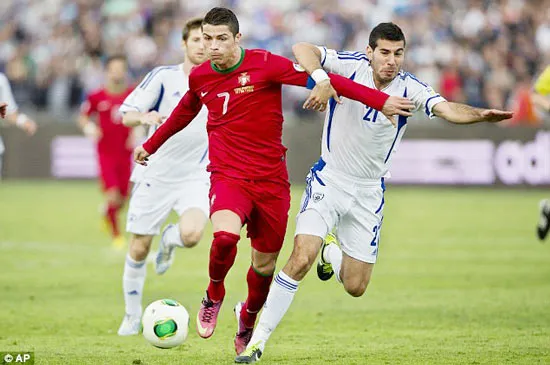Cristiano Ronaldo (trái, Bồ Đào Nha) đi bóng qua hậu vệ Armenia.