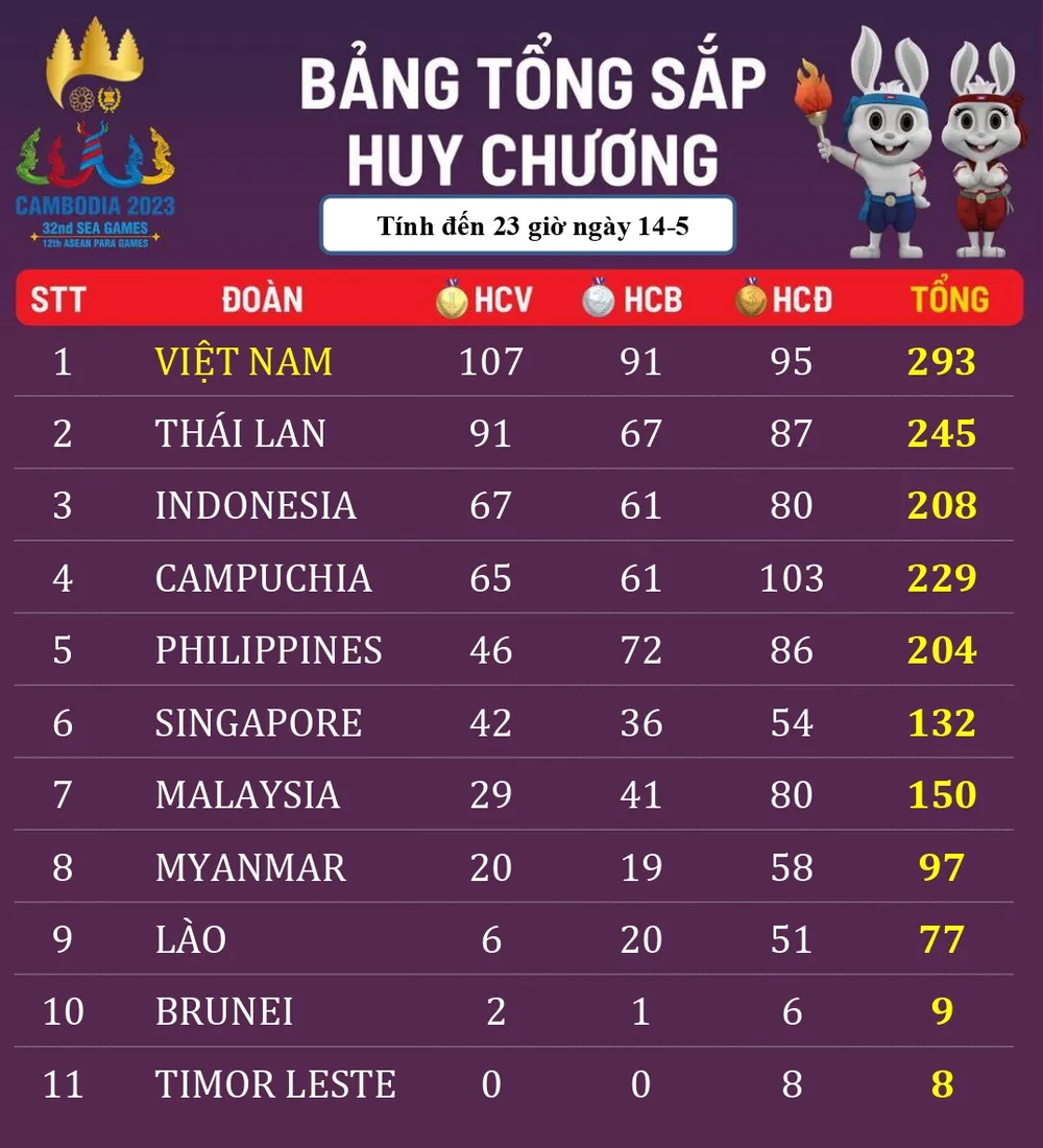Mở màn chiến thắng trong ngày thi đấu 14-5 là cú đúp HCV đến từ đội tuyển aerobic Việt Nam. Như vậy, đội tuyển aerobic Việt Nam đã có kỳ SEA Games đại thành công khi toàn thắng 5/5 nội dung tranh tài: đơn nam, đơn nữ, đôi nam nữ, nhóm 3 người, nhóm 5 người.