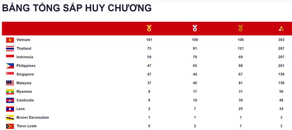 Đoàn thể thao Việt Nam vượt xa số HCV so với Thái Lan đang ở vị trí thứ 2