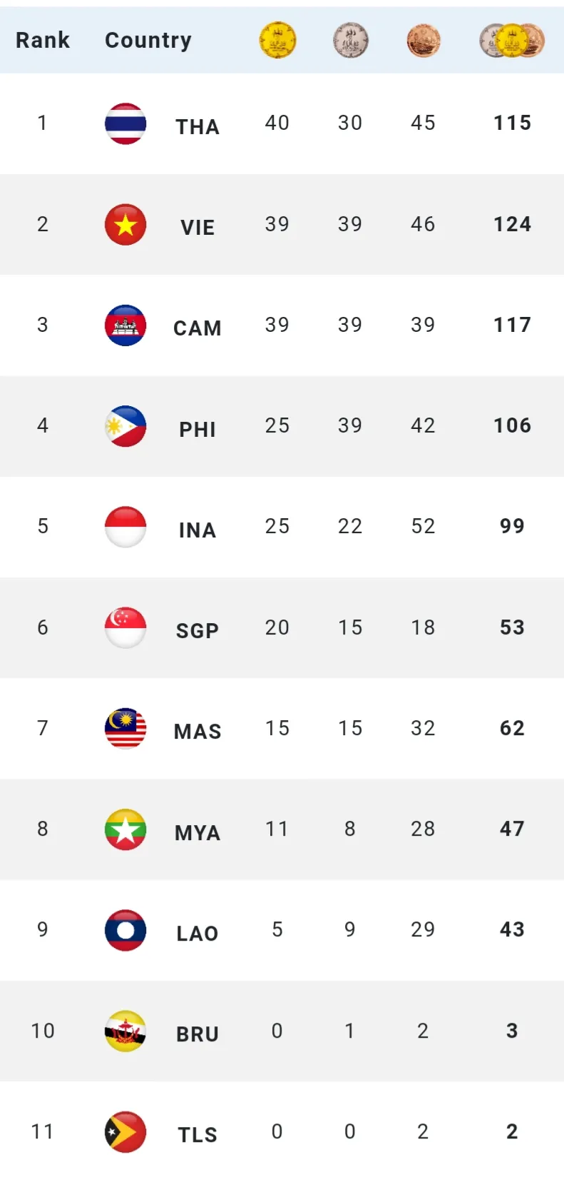Tính đến 22 giờ 30 phút ngày 9-5, đoàn thể thao Việt Nam đã vươn lên vị trí thứ 2 bảng tổng sắp huy chương SEA Games 32 với 39 HCV.