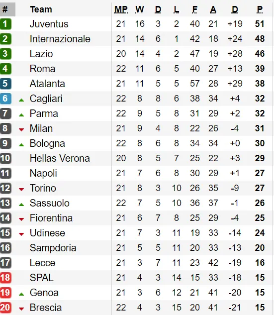 Bảng xếp hạng * Vòng 22 - Serie A: