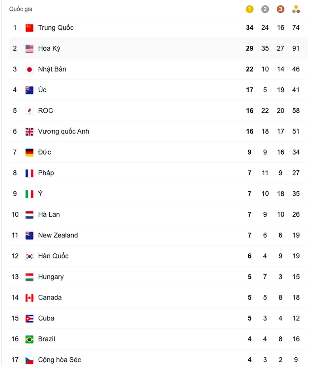 Đoàn thể thao Mỹ đã giành thêm 4 HCV trong ngày thi đấu 5-8, ấn tượng với 2 HCV ở môn điền kinh, khi Ryan Crouser đoạt HCV và phá kỷ lục Olymic nội dung đẩy tạ nam với thành tích 23,3m, trong khi Katle Nageotte bất ngờ đoạt HCV nội dung nhảy sào nữ với 4m90... Cuộc chạy đua trên bảng tổng sắp vẫn diễn ra hấp dẫn khi Trung Quốc tạm dẫn đầu với 34 HCV, 24 HCB và 16 HCĐ. Đoàn Mỹ xếp nhì với 29 HCV, 35 HCB và 27 HCĐ. Đoàn chủ nhà Nhật Bản vẫn bảo vệ an toàn vị trí thứ 3 với 22 HCV, 10 HCB và 14 HCĐ.