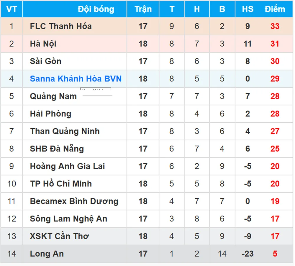 Bảng xếp hạng Toyota V.League 2017 (vòng 18)